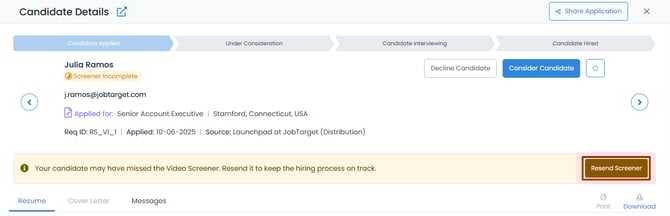 - You can do this in Candidate Manager by clicking the “Resend Screener” button in the Candidate Details.