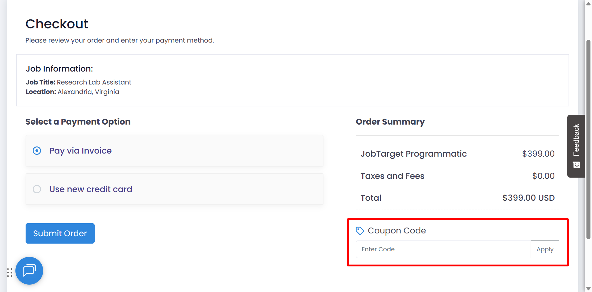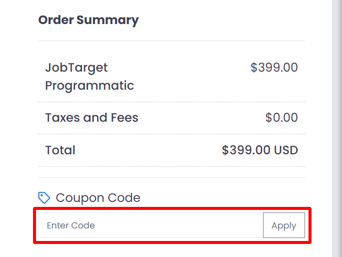 If you've received a coupon code from JobTarget you can easily apply it at checkout in the Marketplace.