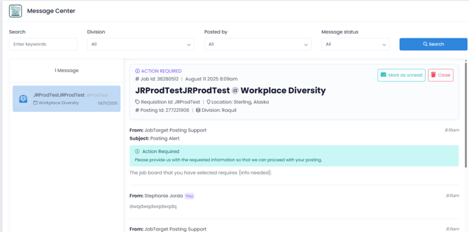 The JobTarget Posting Support Message Center serves as a vital communication tool, enabling our Posting Support Team to reach out to customers when important information needs to be conveyed regarding their job advertisements.