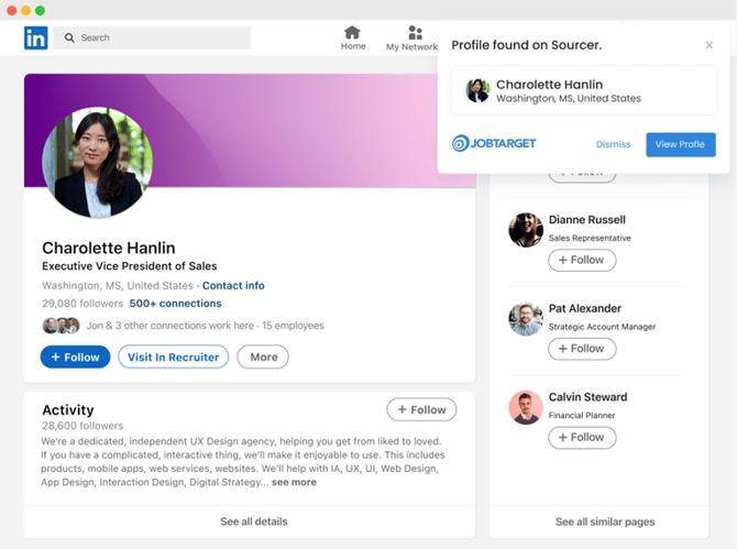 As you browse LinkedIn, we'll notify you whenever you come across a candidate’s online profile that matches a profile in our Sourcer database. This will allow you to easily contact them regarding new opportunities and open roles.