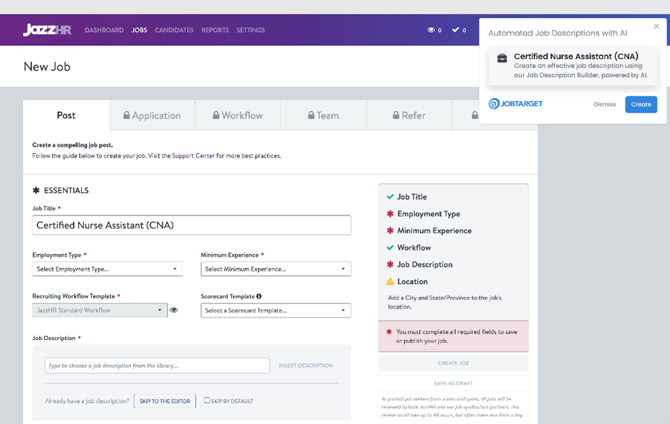 You will receive a notification in the top right corner letting you know that Job Description Builder can help you write the description, with job requirements and responsibilities.