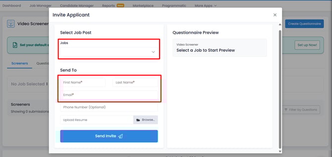 You can also manually invite candidates to complete the Video Screener directly from the platform.