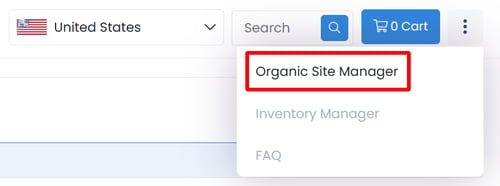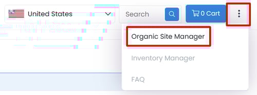 - Click the 3 Dots (Kebab Menu) in the upper right-hand corner next to 'Cart,' then click ‘Organic Site Manager’ in the dropdown menu.