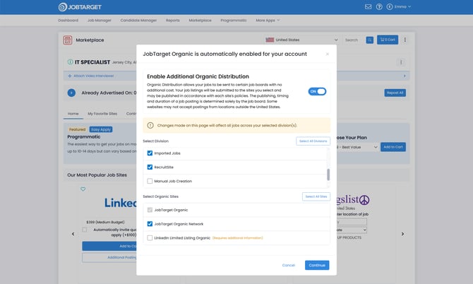 The Organic Site Manager is a product, available through the Marketplace, that can be enabled in order to automatically distribute your jobs to your choice of organic job sites.