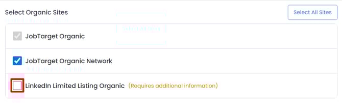 - Use the check-boxes under 'Select Organic Sites' to choose which Organic options you would like your jobs distributed to.