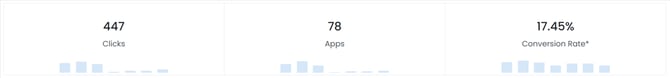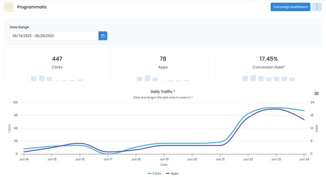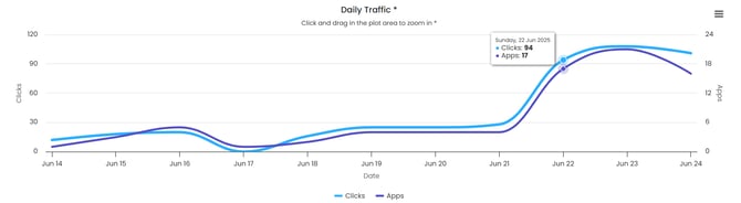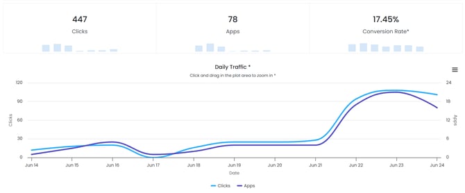 The Daily Traffic Graph shows the clicks and applications received for each day of the selected date-range. Hovering over a specific date column on the graph will show you the specific numbers for that date.