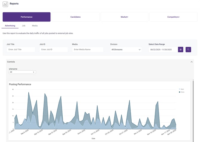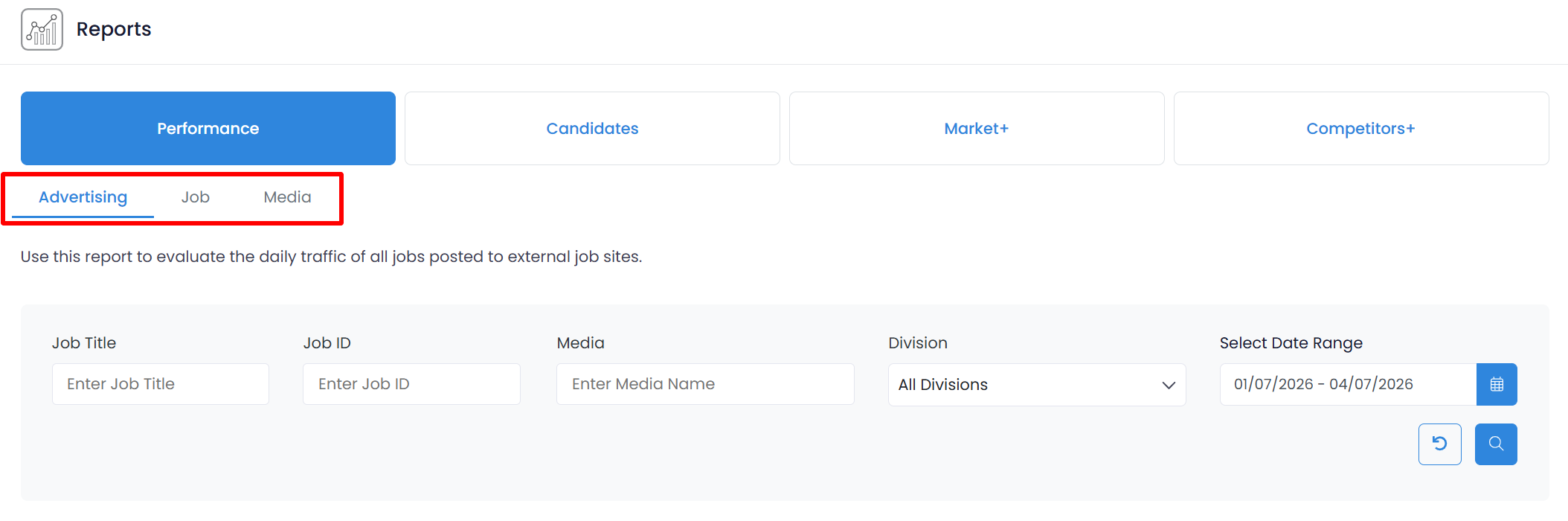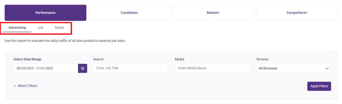 Within the Performance tab of the Reports App there are 3 unique reports available; Advertising Performance, Job Performance, and Media Performance.