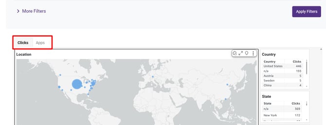 The map can be zoomed and panned to navigate. Hovering over one of the bubbles will display the city name and the number of clicks or apps originating from that location.