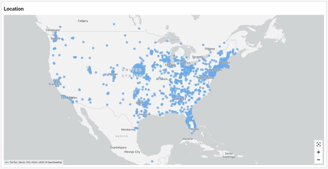 The first section of the Candidate Analysis Report is the Location Map, a bubble map showing the location of the candidates who interacted with a job during the selected time frame.
