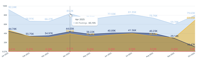 The Monthly Job Summary is an area chart that summarizes job market activity month by month. The chart displays four key metrics: