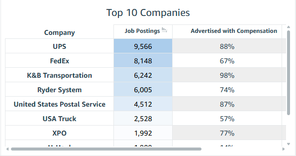 The Top 10 Companies table shows the top 10 companies with the most relevant job postings during your selected time frame.