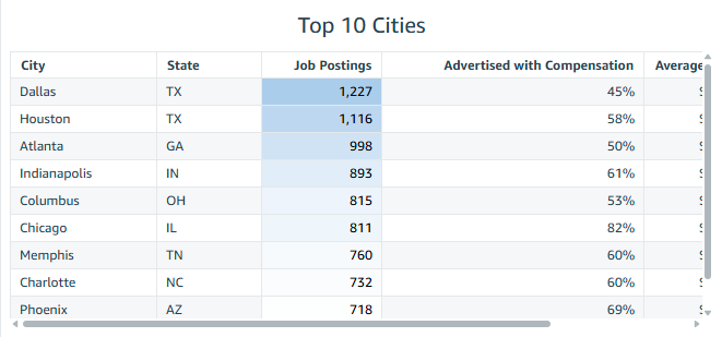 The Top 10 Cities table shows the top 10 cities with the most relevant job postings during your selected time frame.