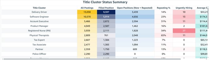 The Title Cluster Status Summary table shows the top relevant title clusters, with details on the postings (within the selected time frame) in each cluster.