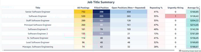 The The Job Title Summary table shows the top relevant job titles (not clustered) with details on the postings (within the selected time frame and matching any applied filters) for each title .