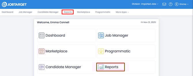 - If using JobTarget in an embedded iFrame, click the menu button in the upper right-hand corner, then click 'Reports.'