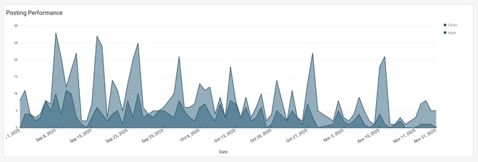 The first section of the Advertising Performance Report is the Posting Performance Chart. This area chart shows the apps and clicks across all advertised jobs within the selected date range and filters, broken down by day.