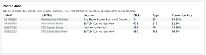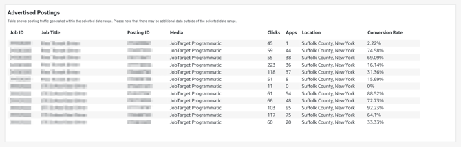 The third and final section of the Advertising Performance Report is the Advertised Posting Table, which provides a breakdown of all Postings within the selected date range and matching any applied filters.
