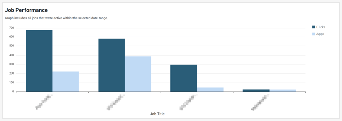 The first section of the Job Performance Report is the Job Performance Graph. This bar graph shows the apps and clicks received on each advertised job within the selected date range and applied filters.