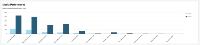 The first section of the Media Performance Report is the Media Performance Graph. This bar graph shows the apps and clicks received across each advertised job within the selected date range and applied filters, broken down by job site.