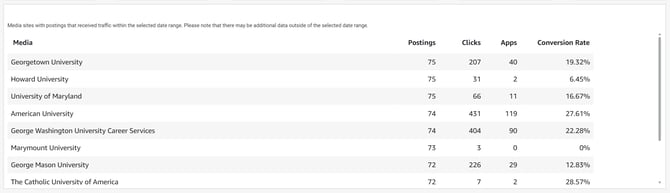 The third and final section of the Media Performance Report is the Media Sites Table, which provides a breakdown of each Job Site to receive traffic within the selected time frame and matching any applied filters.