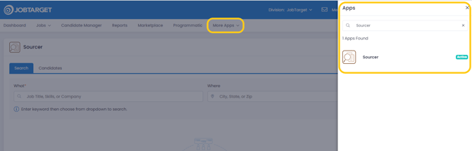 If accessing JobTarget directly, click "More Apps" in the navigation bar and select or search for Sourcer in the menu that pops up.