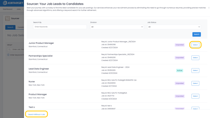You can either click "Select" next to the job of your choice, or click "Search Without A Job" at the bottom of the window. Use the search bar and filters at the top of the window to look for specific jobs.