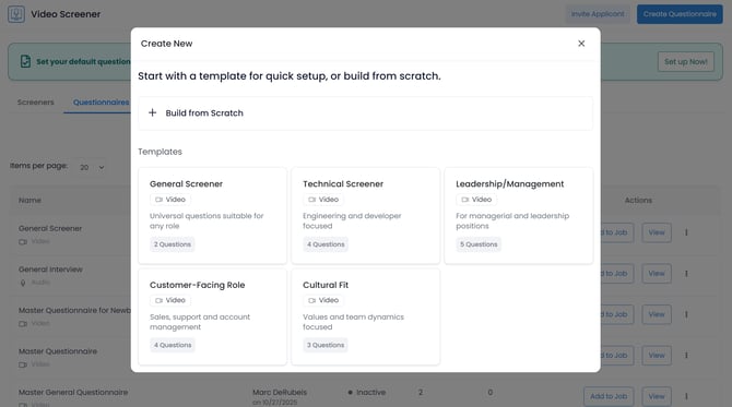 - Click the 'Create Questionnaire' button located in the top right corner of the Video Screener interface.